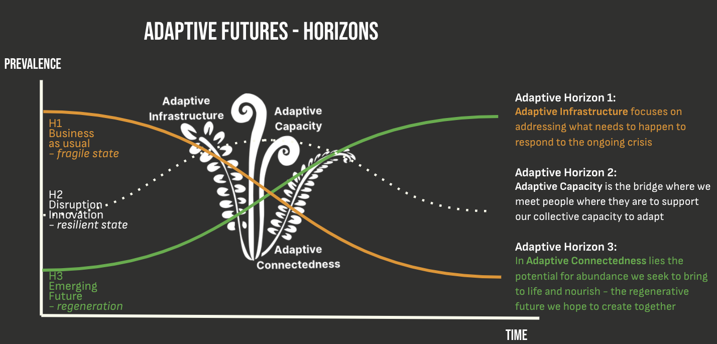 This is the bridge to meeting people where they are to support our collective capacity to adapt (Horizon 2). It's about equipping people with skills to see and question the system they're part of and develop empathy, leadership and agency.