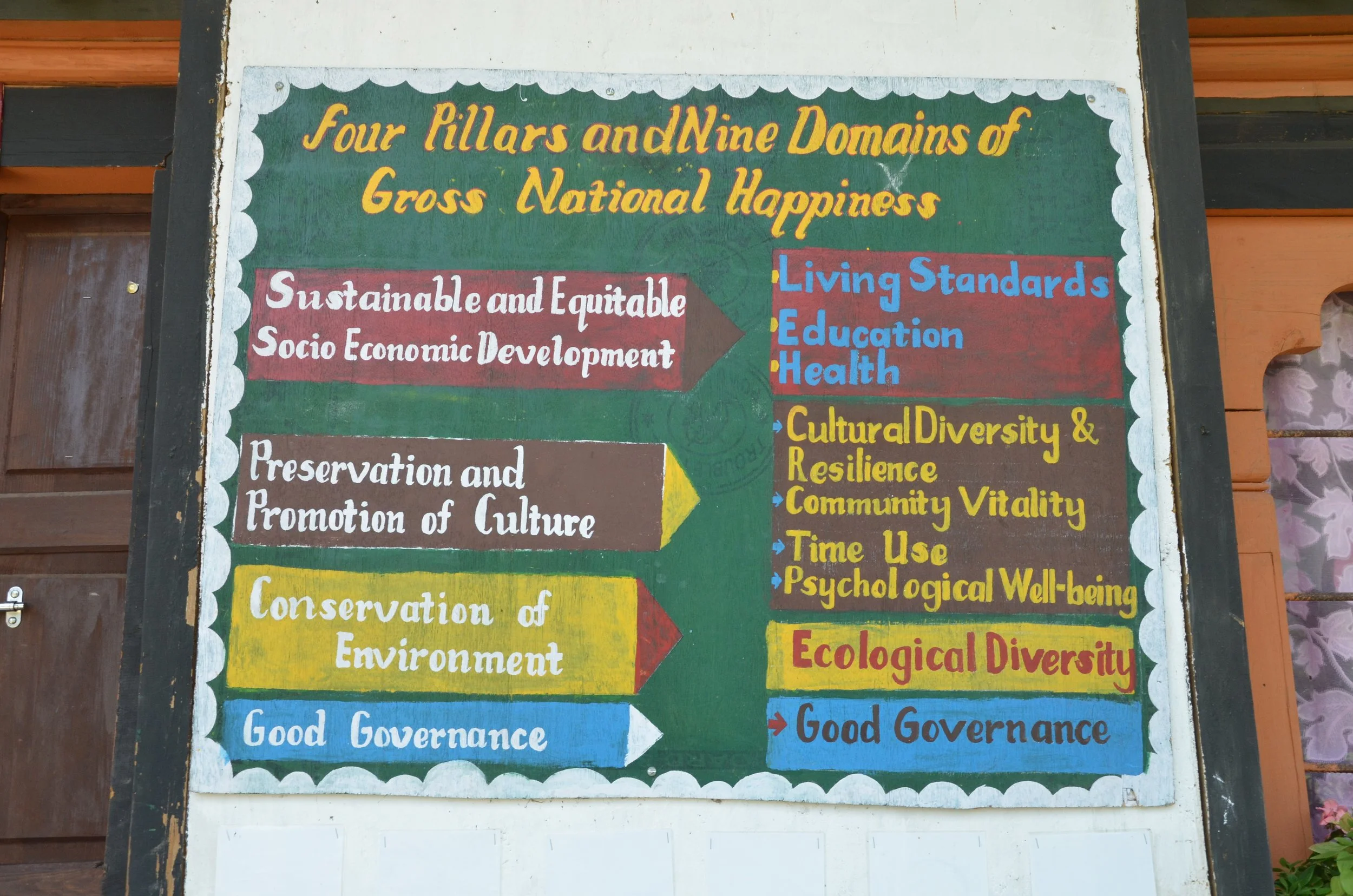 Bhutan is sometimes called the "happiest country on Earth," largely in reference to its policy and measurement system prioritising happiness as a national goal. This is not a superficial understanding of happiness: at a policy level, it is underpinned by a framework that describes individual and collective wellbeing with nine domains and 33 indicators.