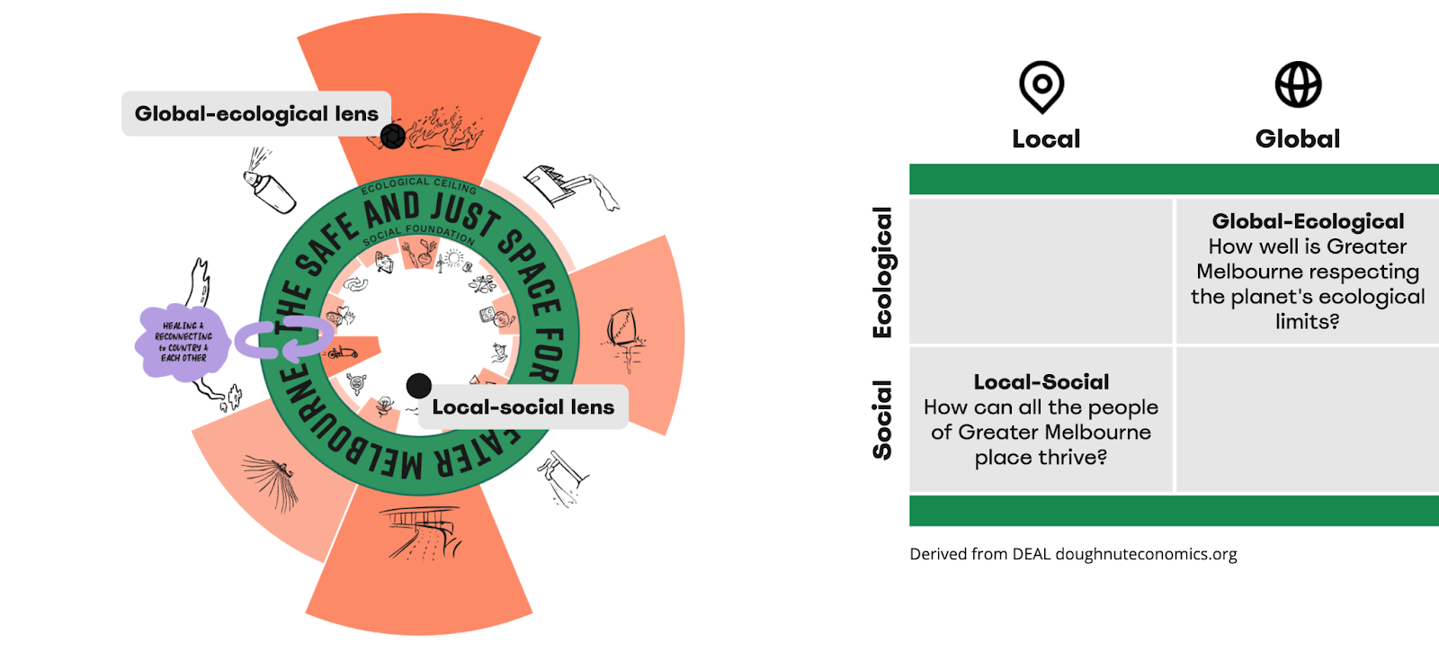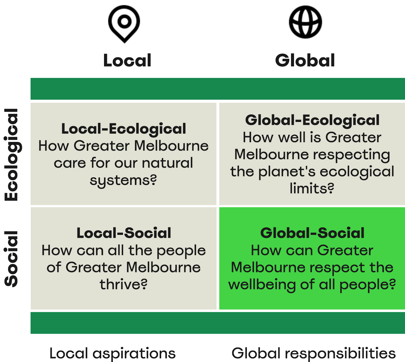 Now, we are ready to complete a 'full' City Portrait according to theDoughnut Economics Action Lab methodology, adding two new lenses. We have started with the 'Global-Social' lens, which helps us to explore the question, How can Greater Melbourne respect the wellbeing of all people?