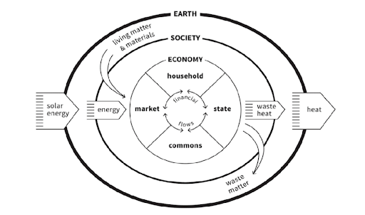 Another view of balance is provided by British economist and author of Doughnut Economics, Kate Raworth. Raworth redefines our economy as being made up of four equally important parts: the market, the state, the household, and the commons. These parts are nested within society and the ecology, in what Raworth describes as “the embedded economy”.