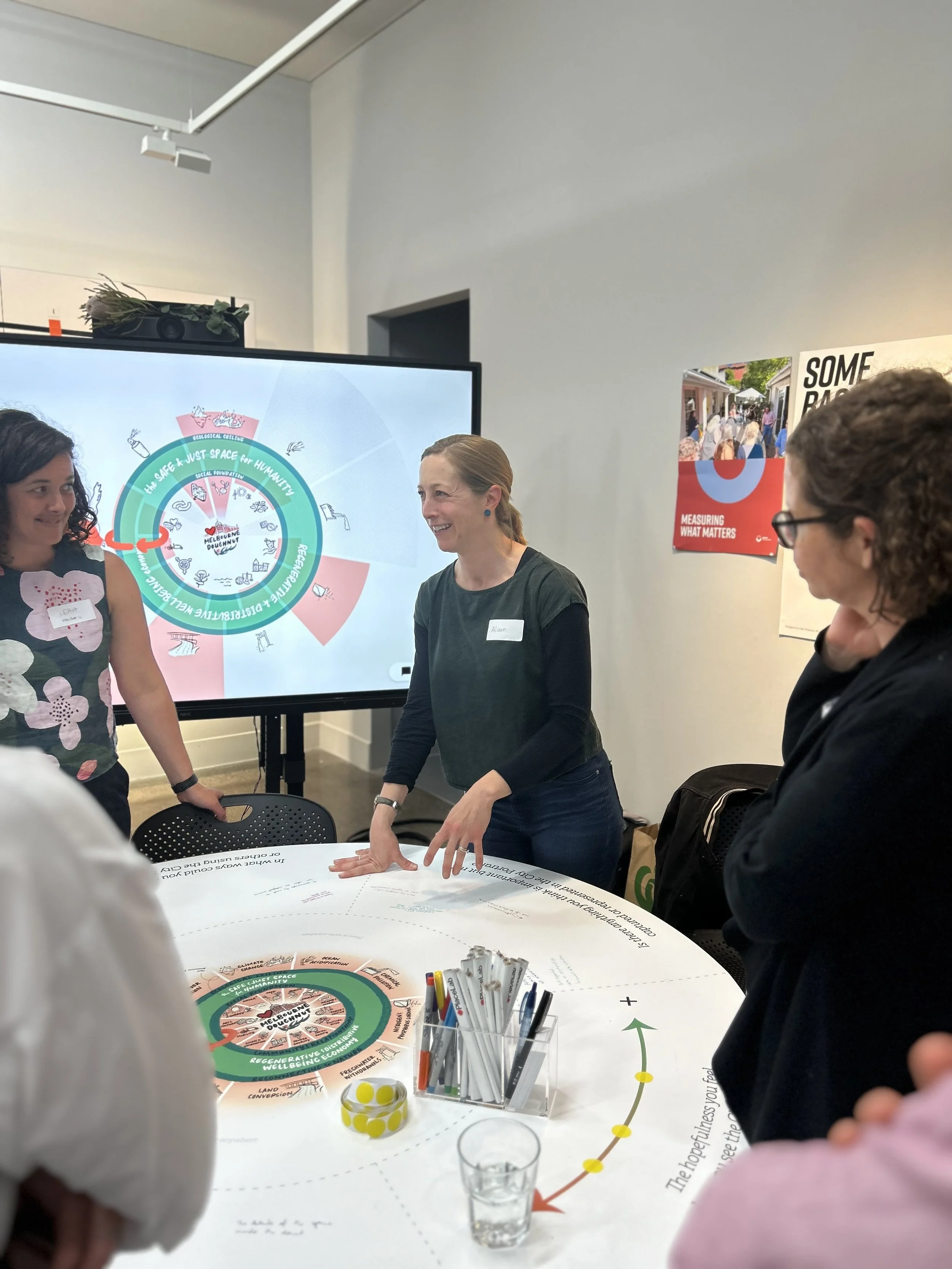 The Doughnut can be used in two ways, as a mirror to reflect how well we're doing toward that ultimate goal, and as a compass to guide us toward what we need to get there. A lot of our recent work has been developing the 'mirror' part, collectively setting the goals then metrics for our social foundations, while working with researchers on our planetary overshoot.
