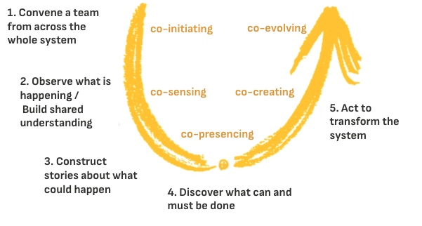 To give an example of an 'adaptation process', let's take a look at Adam Kahane's book Transformative Scenario Planning. Grounded in Otto Scharmer's Theory U framework and practice, the approach offers an intuitive five-step process bringing together the needs of systemic climate change adaptation, and recognising that specific interventions and pathways will emerge from the process. It's worth noting that before a meaningful process can be undertaken, understanding of a given system and building relational tissue is key.